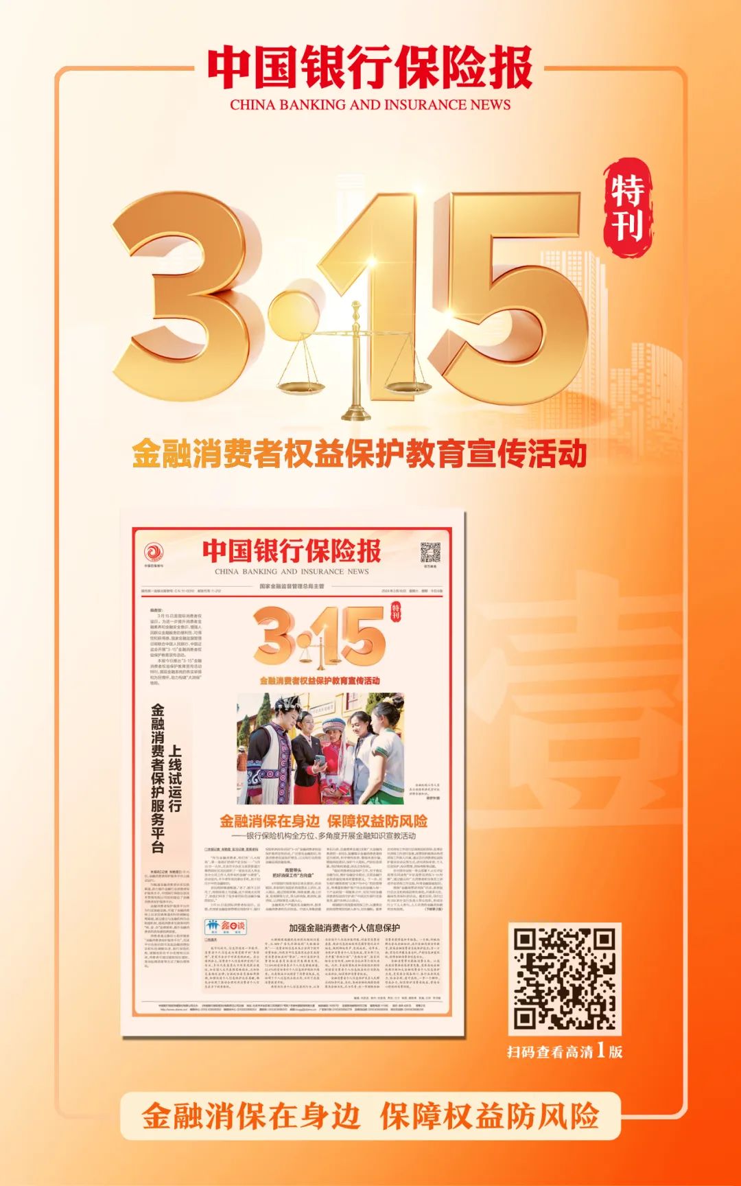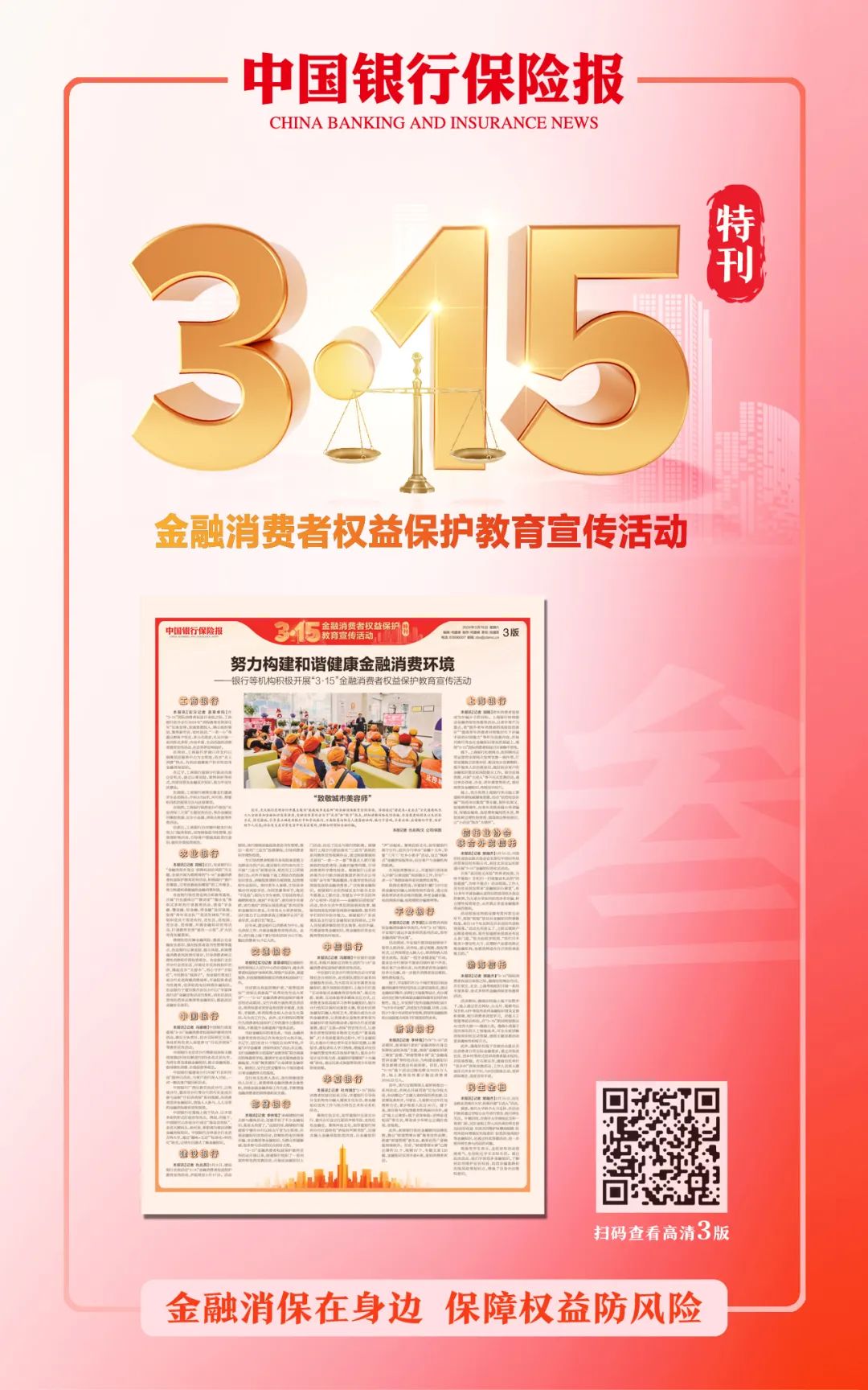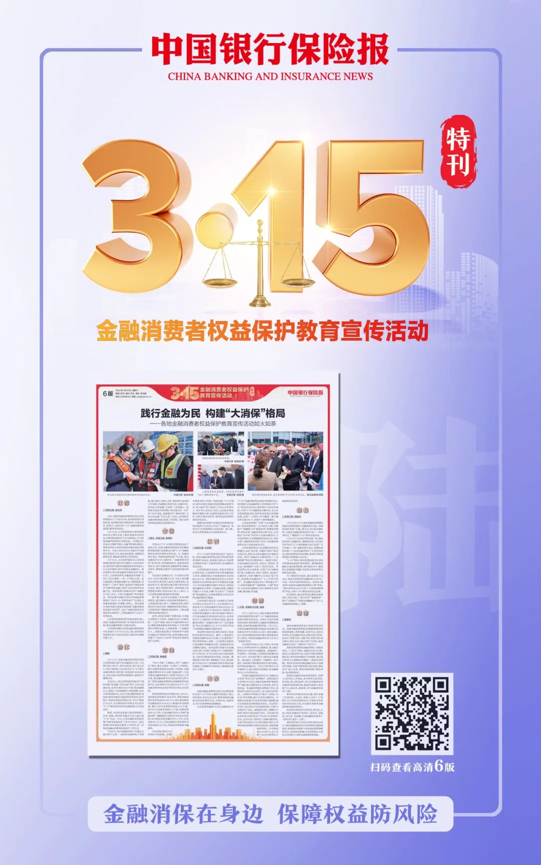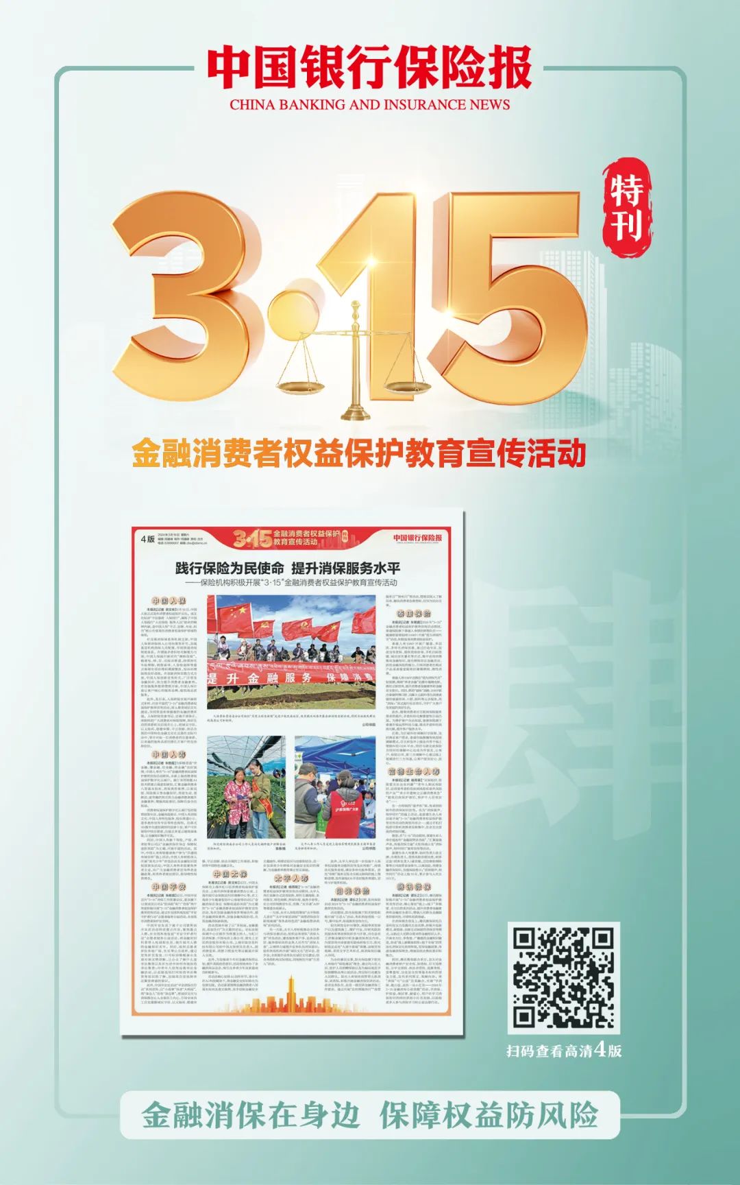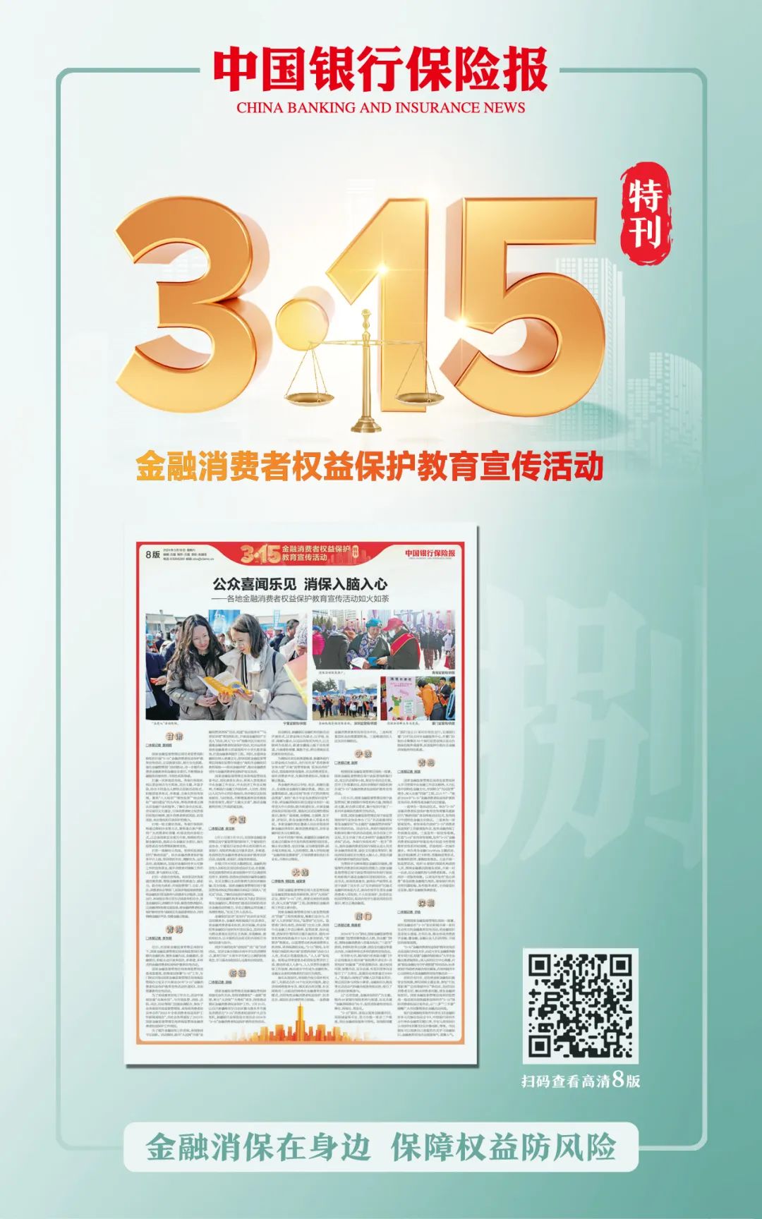 最近,朋友圈“炸锅”了。金融人们纷纷晒出自己的“十八般武艺”,这是为啥?在“3·15”国际消费者权益日到来之际,国家金融监督管理总局联合中国人民银行、中国证监会开展了“3·15”金融消费者权益保护教育宣传活动。金融消保在身边,保障权益防风险。《中国银行保险报》特别推出“3·15”金融消费者权益保护教育宣传活动特刊。特刊共计8版,全面呈现了这一主题活动的盛况。